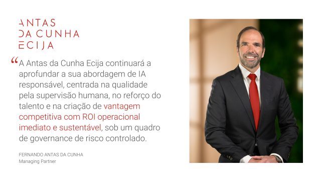 Fernando Antas da Cunha, managing partner, sublinha a aposta numa IA responsável centrada na supervisão humana, desenvolvimento de talento e vantagem competitiva com ROI operacional imediato e sustentável, num quadro de risco controlado.