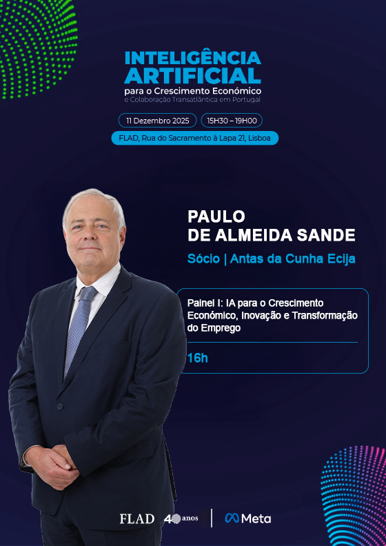Paulo de Almeida Sande, sócio da Área de Prática de Direito da União Europeia, Concorrência e Investimento Estrangeiro da Antas da Cunha Ecija, participa como orador no Painel I – IA para o Crescimento Económico, Inovação e Transformação do Emprego, a realizar-se no dia 11 de dezembro, pelas 16h00, no âmbito da Conferência de Inteligência Artificial para o Crescimento Económico e Colaboração Transatlântica em Portugal.